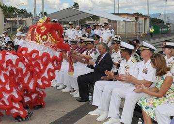Keywords: Chinese ships visit Pearl Harbor-Hickam 130906-N-ZK021-007.jpg en U S and Chinese leaders watch as lion dancers perform during an arrival ceremony for three People's Liberation Army-Navy ships Luhu-class destroyer Qingdao DDG 113 Jiangkai-class frigate Linyi FFG 547 and a Fuqing-class fleet oiler as they arrive in Hawaii for a scheduled port visit Over the weekend Chinese and U S leaders will conduct dialogues to build confidence and mutual understanding between the two nations The port visit is part of the U S Navy's ongoing effort to maximize opportunities for developing relationships with foreign navies to build trust encourage multilateral cooperation enhance transparency and avoid miscalculation in the Pacific U S Navy photo by Mass Communication Specialist 2nd Class Nardel Gervacio/Released 2013-09-06 Petty Officer 2nd Class Nardel Gervacio https //www dvidshub net/image/1011909 130906-N-ZK021-007 2013-09-06 22 57 JOINT BASE PEARL HARBOR-HICKAM HI US PD-USGov-Military-Navy 2013 in Pearl Harbor People at Joint Base Pearl Harbor-Hickam Images from DoD uploaded by Fæ