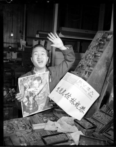 Keywords: blackandwhite people monochrome black and white Chinese Times Grey Cup win headlines VPL Accession Number: 41639 Date: November 26, 1955 Photographer/Studio: Province Newspaper Content: The 43rd Grey Cup game was played on November 26, 1955 before 39,417 football fans at Empire Stadium in Vancouver. The Edmonton Eskimos beat Montreal Alouettes by the score of 34 to 19. Topic: Chinese Canadians Newspapers Printers Printing industry Football Grey Cup Person: Kwong, Normie Organization: Chinese Times Location: British Columbia - Vancouver - 1 East Pender Street More information on our historical photograph collection: www.vpl.ca/historicalphotos Chinese Times Grey Cup win headlines VPL Accession Number: 41639 Date: November 26, 1955 Photographer/Studio: Province Newspaper Content: The 43rd Grey Cup game was played on November 26, 1955 before 39,417 football fans at Empire Stadium in Vancouver. The Edmonton Eskimos beat Montreal Alouettes by the score of 34 to 19. Topic: Chinese Canadians Newspapers Printers Printing industry Football Grey Cup Person: Kwong, Normie Organization: Chinese Times Location: British Columbia - Vancouver - 1 East Pender Street More information on our historical photograph collection: www.vpl.ca/historicalphotos