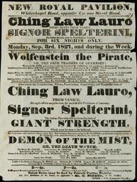 | Keywords: Ching Lau Lauro1827.jpg New Royal Pavilion Whitechapel Road London poster of Monday 3 September 1827 advertising the magician Ching Lau Lauro name mis-spelt http //www elta-project org/fedora-stg/get/elta 1136/JPEG_800_001 jpg 1827-09-03 Anon PD-old-70-1923 Ching Lau Lauro Entertainment in the United Kingdom Playbills of the United Kingdom |
