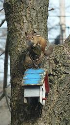 Keywords: chipmunk nature animal wildlife mammal tree branch trunk birdhouse small furry cute