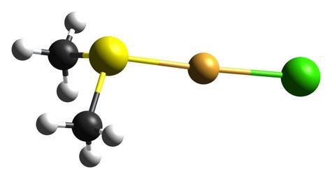 | Keywords: Chloro(dimethyl-sulfide)gold(I)-from-xtal-1988-CM-3D-shiny-balls.png Ball-and-stick model of the chloro dimethyl sulfide gold I molecule Me<sub>2</sub>SAuCl based on the crystal structure Colour code Carbon C black Hydrogen H white Sulfur S yellow Gold Au gold Chlorine Cl green Crystal structure from <br> Acta Cryst C 1988 44 12 2089 2091 Chloro dimethyl sulfide gold I 10 1107/S0108270188009151 Image generated in http //www crystalmaker com/ CrystalMaker 8 2 Own 2010-07-15 Ben Mills Benjah-bmm27 Images by Ben Mills Ball-and-stick models Chloro dimethyl sulfide gold I |