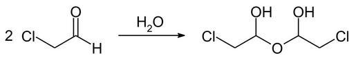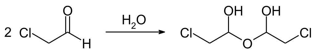 Keywords: Chloroacetaldehyde reaction01.svg en Formation of the hemihydrate of chloroacetaldehyde de Bildung des Hemihydrats von Chloracetaldehyd own Steffen 962 2015-05-05 PD-chem Chloroacetaldehyde Cc-zero