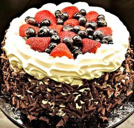 Keywords: chocolate layer cake chocolate shavings strawberries blueberries whipped cream food