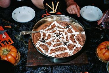 Keywords: Chocolatepudding.jpg en Chocolate pudding sv Chokladpudding own Anette B 2003 Halloween food Chocolate pudding Spider-shaped food Spider web frosting White icing food Black spiders in art Sprinkles