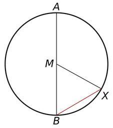 | Keywords: Chord in mathematics.svg en A circle with a line AB through the center M and a chord BX marked in red between points on the edge of the circle Own work by uploader labels based on bitmap equivalent Image Chord_in_mathematics png Qef hand-written SVG 2008-07-03 <gallery>Image Chord_in_mathematics png Bitmap version with useless title Image Chord-in-mathematics JPG Bitmap version with center in wrong place and useless title</gallery> Qef ImageNote 1 141 142 8 8 220 250 2 Line MX is equal to Line MB M is the midpoint therefore MX MB radii So is the angle at B equal to the angle at X triangle MBX is an isoceles triangle ImageNoteEnd 1 Chord geometry Circular sectors |