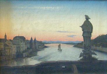 | Keywords: Christian Philipp Koester Alte Brücke Heidelberg.jpg Heidelberg Alte Brücke mit Nepomuk oil canvas 0 295 m x 0 405 m private property About the image žDie Figur des heiligen Nepomuk als Brückenheiliger wurde nach dem Hochwasser von 1784 nicht mehr auf dem Neubau der Brücke sondern vor einem Garten in der Neuenheimer Landstraße aufgestellt Koesters Bild stellt die Figur wieder auf die Balustrade der Brücke zurück wendet ihren Blick aber nach Westen Links in der Bildmitte die Neckarfront der Altstadt mit den beiden Marstall-Türmen und dem Turm der Providenzkirche Quelle http //www zum de/Faecher/G/BW/Landeskunde/rhein/kultur/ausstell/biedermeier/koest5 htm Online-Katalog der Heidelberger Biedermeier-Ausstellung von 1999 About the painter Christian Philipp Köster 1784-1851 war Maler und einer der ersten Restauratoren Er restaurierte Gemälde für die Sammlung Boisserée in Heidelberg und für die Königlichen Gemäldegalerie Berlin Seine Schriften zur Restauration alter Ölgemälde gelten als wegweisend in der Geschichte der Restaurierung Bibliography Thomas Rudi Christian Philipp Koester 1784 - 1851 Maler und Restaurator Monographie mit kritischem Å’uvreverzeichnis Frankfurt 1999 ISBN 3-631-32446-4 http //www zum de/Faecher/G/BW/Landeskunde/rhein/kultur/ausstell/biedermeier/koest5 htm Other versions PD-art Alte Brücke Heidelberg painting Heidelberg in art painting Bridges in art Statues of John of Nepomuk in Heidelberg Alte Brücke Baroque statues of Christian saints in Heidelberg Alte Brücke 1738 statues in Baden-Württemberg Heidelberg Neckar in Heidelberg Neckar in art Biedermeier paintings Christian Philipp Koester |