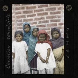 | Keywords: Christian School Girls, Jammu, ca.1875-ca.1940 (imp-cswc-GB-237-CSWC47-LS10-049).jpg en <br> Christian School Girls Jammu ca 1875-ca 1940 Photograph of a group of 5 young Indian Christian school girls The girls are pictured in a group standing in front of a red brick wall ; This belongs to a series of Church of Scotland Foreign Missions Committee lantern slides relating to Jammu City which is also known as the City of Temples A mission station occupied by Church of Scotland missionaries was founded here in the late 19th/early 20th century Jammu is also one of the three administrative divisions within Jammu and Kashmir the northernmost state in India Photographer Unknown Filename imp-cswc-GB-237-CSWC47-LS10-049 tif Coverage date 1875/1940 Part of collection International Mission Photography Archive ca 1860-ca 1960 Geographic subject region Jammu and Kashmir Type images Part of subcollection Photographs from the Centre for the Study of World Christianity University of Edinburgh U K ca 1900-ca 1940s Repository name Centre for the Study of World Christianity Archival file impaunpub_Volume7/1766 url Repository address The University of Edinburgh School of Divinity New College Mound Place Edinburgh EH1 2LX United Kingdom Geographic subject country India Format aacr2 1 lantern slide 8 x 8 cm Geographic subject continent Asia Rights Contact the repository for details Part of series In the Temple City of Jammu LS10 Repository email divinity-CSWC ed ac uk Subject lcsh Keyword Religious education; Children Date created 1875/1940 Publisher of the digital version University of Southern California Libraries Subject aat genre group portraits Format aat lantern slides Legacy record ID impa-m69317 Access conditions http //www ed ac uk/schools-departments/divinity/research/centres/world-christianity/collections-resources File GB 237 CSWC47/LS10/49 1875/1940 author http //digitallibrary usc edu/cdm/ref/collection/p15799coll123/id/64883 PD-old-70-1923 Magic lantern images Images from USC Digital Library uploaded by Fæ International Mission Photography Archive ca 1860-ca 1960 People of Jammu |
