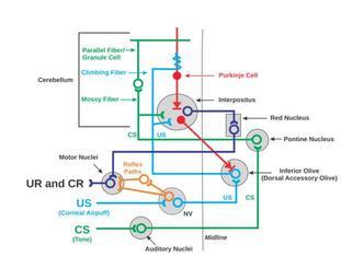 | Keywords: Christian and Thompson Figure 5 SVG.svg en The basic essential circuitry for classical eye-blink conditioning The CS green pathway starts as sensory information in this example an auditory tone entering via the vestibulocochlear nerve and associate with neurons in the auditory nuclei Cells the auditory nuclei project to the contralateral pontine nuclei where they synapse onto third order neurons that project back across midline and enter the cerebellum send a collateral to the interpositus deep cerebellar nuclei and synapse onto granule cells Granule cells in turn continue to the cerebellar cortex forming parallel fibers The US is a puff of air to the eye that enters the via the trigeminal nerve and synapses onto neurons within the trigeminal nucleus NV From the trigeminal complex the first efferent pathway UR reflex paths; orange pathway is a direct projection to facial motoneurons controlling the orbicularis oculi muscle as well as presumably inhibition of the levator palpebrae superioris motoneurons in the caudal central subdivision of the oculomotor nucleus peripheral and direct synapses to Motor nuclei Additionally the US light blue pathway has a second projection with neurons projecting out of the trigeminal nucleus to the contralateral side where they synapse onto third order neurons in the dorsal accessory olive division of the inferior olivary nucleus The third order neurons in the US pathway project back across midline enter the cerebellum sending an excitatory collateral to the interpositus deep cerebellar nuclei then continuing to form climbing fibers on purkinje Pontocerebellar CS and olivocerebellar US collaterals to the interpositus nuclei initiate the CR pathway navy blue pathway Activated cells in the interpositus nucleus project to neurons in the red nucleus which then project on to pre- and motoneurons necessary for blink behavior Purkinje are transiently activated by individual parallel fibers and largely activated by climbing fibers when stimulated they project down to the interpositus nuclei and have an inhibitory effect red pathways Modified from Christian and Thompson 2003; figure 5 2013-01-11 12 29 09 Review Neural Substrates of Eyeblink Conditioning Acquisition and Retention Christian and Thompson PD-USGov Uploaded with UploadWizard Neuroscience Cerebellum Neuroanatomy Learning Behavioral Research Blink Reflex Research Classical Eye-Blink Conditioning Classical conditioning |