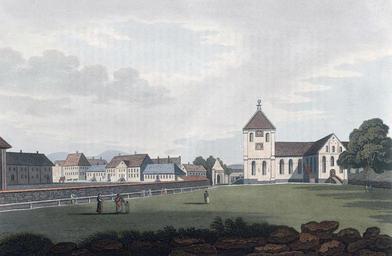 | Keywords: Christiania great Church (JW Edy plate 51).jpg Artwork Creator John William Edy Christiania great Church No LI GREAT CHURCH AT CHRISTIANIA This Cathedral Church is situated nearly in the centre of the city forming one side of the great square Its form is that of the Greek cross On the south transept over the upper windows is inscribed the date 1624 in which year the old town of Opsloe was burnt The style throughout the edifice is Saxon Gothic The high roof is covered with a dark glazed pantile There was originally an elegant spire which is supposed to have been accidentally struck down by the guns of the garrison during the attempt made to drive Charles XII and his army from the possession of the city Soon after that period the present cap was added to the great western tower and the project of replacing the spire appears to have been abandoned On the side fronting the observer is an ancient clock and below it a sun-dial On another side over the great door are the king's arms his three crowns Christian V of Denmark Christian V c On the outside of the church are several covered staircases for the convenient access of particular families to their pews or rooms which are surrounded with glass sashes within There is an extensive burial ground on the right within a strong pallisado bordered by a row of trees The whole was encompassed with a stone wall having gothic entrances decorated with the king's arms It was deemed expedient to have another burial ground at a little distance from the town when the part of the old wall seen on the left of the picture was taken down and the void space to the pales was added to the square The church within is spacious and convenient having a good altar pulpit stained glass windows organ baptismal font pews c with a throne for the king and another for the bishop Some flags and other trophies are suspended from its walls particularly two one yellow the other red The monuments tablets and other appropriate mementos of noble families are too numerous to mention Among the names of the defunct are those of Mr Collett of Ulivold and of some ladies who were natives of England Their remains rest in company with the venerated reliques of one who as a merchant ranked high still higher as a man The sepulchre is bedewed with many a silent tear where he and his lady sleep in the secure hope of receiving the blessings reserved as a reward for a life of virtue To a Norwegian this apostrophe needs no explanation it is for the information of my countrymen that I record the name of this illustrious individual Bernard Anker He died in Copenhagen and his corpse being removed by sea was interred at Christiania with those impressive and solemn obsequies which testify the public feeling of a great national loss The division of Christiania between the cathedral and the Akershus Fortress garrison of Aggerhus is regularly built having spacious streets at right angles with fountains at the intersections Those which project towards the castle are completely commanded by its guns When the intrepid Charles XII of Sweden Charles XII had occupied this city he was often seen from the batteries unattended in the streets reconnoitring the castle of which he never obtained possession Many shots were aimed at him that are now to be seen fast in the walls of several houses where they are carefully preserved in their positions and gilt on the parts still visible as a memento of the fact Collapse bottom http //urn nb no/URN NBN no-nb_digibok_2011072910001 Boydell's picturesque scenery of Norway London 1820 Plate no 51 p 277 in scanned copy no-nb_digibok_2011072910001 PD-Art-100 John William Edy Boydell's picturesque scenery of Norway Historical images of Oslo Domkirke Oslo in art Aquatint 1800 in Norway |