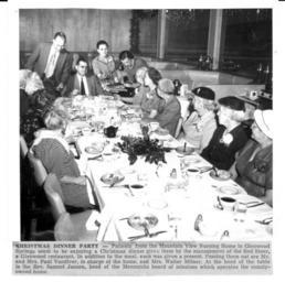 | Keywords: mennonite board of missions mennoniteboardofmissions sam janzen samjanzen paul vandiver paulvandiver mountain view nursing home mountainviewnursinghome glenwood springs glenwoodsprings Caption: Patients from the Mountain View Nursing Home in Glenwood Springs enjoy a Christmas dinner given by the management of the Red Steer, A Glenwood Restaurant . In addition to the meal, each was given a present. Passing them out are Mr. and Mrs. Paul Vandiver, in charge of the home, and Mrs. Milner. At the head of the table is the Rev. Sam Janzen, head of the Mennonite Board of Missions which operates this county owned home. Jan. 1958. Caption: Patients from the Mountain View Nursing Home in Glenwood Springs enjoy a Christmas dinner given by the management of the Red Steer, A Glenwood Restaurant . In addition to the meal, each was given a present. Passing them out are Mr. and Mrs. Paul Vandiver, in charge of the home, and Mrs. Milner. At the head of the table is the Rev. Sam Janzen, head of the Mennonite Board of Missions which operates this county owned home. Jan. 1958. |