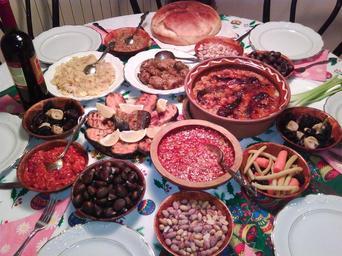 | Keywords: Christmas Eve (Badnik) Dinner Table Macedonian.jpg en Macedonian Christmas Eve Badnik Dinner Table Fish Beans Paprika salads Sarma Dates Figs Chestnuts and the Bread loaf with concealed coin Prepared according to the rules of fasting mk Бадникова т пеза Риба тавче-г авче са ма лутеница смокви у ми костени и лепче со ск иена па ичка п иготвени спо ед п авилата на постот Own Crnorizec 2009-01-06 Permission granted by the author me to use modify and distribute this image freely Cuisine of the Republic of Macedonia Christmas dinner Table with food |