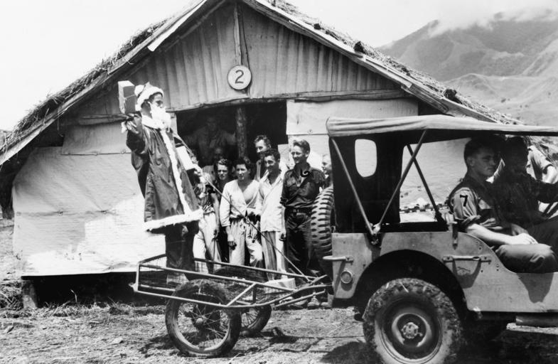 | Keywords: christmas australian war memorial australianwarmemorial history world war ii worldwarii christmas across the commons christmasacrossthecommons christmas 1943 christmas1943 blackandwhite monochrome outdoor black and white ID Number: 062771 Maker: Stuckey, Norman Bradford Ramu Valley, New Guinea. NX103434 Captain F. D. Smith, dressed as Father Christmas, arriving at one of the wards of the main dressing station, 2/6th Australian Field Ambulance, in a jungle cart (Thompson Stretcher), drawn by a jeep, to distribute Christmas presents to the patients. Identified personnel are: SX28258 Private E. J. Cummings; TX5952 Private R. G. Viney, and Corporal R. Roessler. Rights Info: No known copyright restrictions. This photograph is from the Australian War Memorial's collection www.awm.gov.au Persistent URL: cas.awm.gov.au/photograph/062771 ID Number: 062771 Maker: Stuckey, Norman Bradford Ramu Valley, New Guinea. NX103434 Captain F. D. Smith, dressed as Father Christmas, arriving at one of the wards of the main dressing station, 2/6th Australian Field Ambulance, in a jungle cart (Thompson Stretcher), drawn by a jeep, to distribute Christmas presents to the patients. Identified personnel are: SX28258 Private E. J. Cummings; TX5952 Private R. G. Viney, and Corporal R. Roessler. Rights Info: No known copyright restrictions. This photograph is from the Australian War Memorial's collection www.awm.gov.au Persistent URL: cas.awm.gov.au/photograph/062771 |