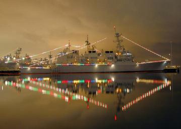 Keywords: christmas lights decoration navy ship pier harbor bright reflection water uss john paul jones usa winter seasonal decorative