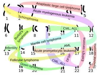| Keywords: Chromosomal translocations.svg Chromosomal translocations giving an overview of chromosomes involved Precise locations within the chromosomes are not specified Most are cancer forms but also other conditions e g t 1;11 which is is associated with schizophrenia<ref name semple> cite journal Semple CA Devon RS Le Hellard S Porteous DJ Identification of genes from a schizophrenia-linked translocation breakpoint region Genomics 73 1 123 “6 2001 April 11352574 10 1006/geno 2001 6516 </ref> Chromosomes are arranged in standard karyogram order Abbreviations ALL - Acute lymphoblastic leukemia AML - Acute myeloid leukemia CML - Chronic myelogenous leukemia DFSP - Dermatofibrosarcoma protuberans References See also Chromosomal translocations reflist File Human karyotype svg Public Domain Mikael Häggström gallery of 2014 2009-04-08 thumb left 300px png-version Chromosomal translocations Karyotypes Schizophrenia |