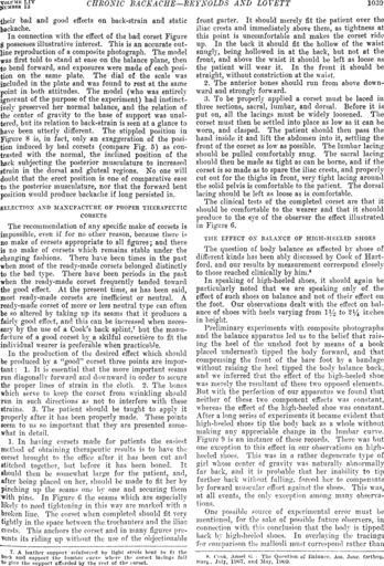 | Keywords: ChronicBackache1039.png CHRONIC BACKACHE--REYNOLDS AND LOVETT Journal of the American Medical Association Chicago Ill 1910 REYNOLDS Edwards AND LOVETT Robert W PD Image ChronicBackache1038 png PD-old their bad and good effects on back-strain and static backache In connection with the effect of the bad corset Figure 8 posses es illustrative intercst This is an accurate outline reproduction of a composite photograph The model was first told to tand at ea e on the balance plane then to bend forward and exposures were made of each position on the same plate The dial of the scale was included in the plate and was entirely to rest at the same point in both attitndes The model who was entirely ignorant of the purpose of the experiment had instinctively preserved her normal balance and the relation of the center of gravity to the base of support was unaltered but its relation to back-strain is seen at a glance to have been utterly different The stippled position in Figure 8 is in fact only an exaggeration of the position induced by bad corsets compare Fig 5 as contrasted with the normal the inclined position of the back subjecting the posterior musculature to increased strain in the dorsal and gluteal regions No one will doubt that the erect position is one of comparative ease to the posterior musculature nor that the forward bent position would produce backache if long persisted in <center>SELECTJON AND MANUFACTURE OF PROPER THERAPEUTIC CORSETS</center> The recommendation of any specific make of corsets is impossible even if for no other reason because there is no make of corsets appropriate to all figures; and there is no make of corsets which remains stable under the changing fashions There have been times in the past when most of the reach-made corsets belonged distinctly to the bad type There have been periods in the past when the ready-made corset frequently tended toward the good effect At the present time as has been said most ready-made corsets are inefficient or neutral A ready-made corset of more or less neutral type can often be so altered by taking up its seams that it produces a fairly good effect and this can be increased when necessary by the use of a Cook's back splint <ref>7</ref> but the manufacture of a good corset by a skilful corsetière to fit the indiviclual wearer is preferable when practicable In the production of the desired effect which should be produced by a good corset three points are important 1 It is essential that the more important searns run diagonally forward and downward in order to secure the proper lines of strain in the cloth 2 The bones which serve to keep the corset from wrinkling should run in such directions as not to interfere with these strains 3 The patient should be taught to apply it properly after it has been properly made These points seem to us so important that they are presented somewhat in detail 1 In having corsets made fur patients the easiest method of obtaining therapeutic results is to have the corset brought to the office after it has been cut and stitchcd together but before it has been boned It should then be somewhat large for the patient and after being placed on her should he made to fit her by pinching up the seams one by one and securing them with pins In Figure 6 the seams which are especially likely to need tightening In this way fire marked with a broken line The corset when completed should fit very tightly in the space between the trochanters and the iliac crests This anchors the corset and in many figures prevents its rifling up without the use of the objectionable front garter It should merely fit the patient over the iliac crests and immediately above them as tightness at this point is uncomfortable and makes the corset ride up In the back it should fit the hollow of the waist snugly being hollowed in at the back but not at the front and above the waist it should be left as loose as the patient will wear it In the front it should be straight without constriction at the waist 2 The anterior bones should run from above downward and strongly forward 3 To be properly applied a corset must be laced in three sections sacral lumbar and dorsal Before it is put on all the lacings must be widely loosened The corset must then be settled into place as low as it can be worn and clasped The patient should then pass the hand inside it and lift the abdomen into it settling the front of the corset as low as possible The lumbar lacing should be pulled comfortably snug The sacral lacing should then be made as tight as can be borne and if the corset is so made as to spare the iliac crests and properly cut out for the thighs In front very tight lacing around the solid pelvis is comfortable to the patient The dorsal lacing should be left as loose as is comfortable The clinical test of the completed corset are that it should be comfortable to the wearer and that it should produce to the eye of the observer the effect illustrated in Figure 6 <center>THE EFFECT ON BALANCE OF HIGH-HEELED SHOES</center> The question of body balance as affected by shoes of different kinds has been ably discussed by Cook of Hartford and our results by measurement correspond closely to those reached clinically by him <ref>8</ref> In speaking of high-heeled shoes it should again be particularly noted that we are speaking only of the effect of such shoes on balance and not of their effect on the foot Our observations dealt with the effect on balance of shoes with heels varying from 1½ to 2 <sup>1</sup>/<sub>4</sub> inches in height Preliminary experiments with composite photographs and the balance apparatus led us to the belief that raising the heel of the unshod foot by means of a book placed underneath tipped the body forward and that compressing the front of the bare foot by a bandage without raising the heel tipped the body balance back and we inferred that the effect of the high-heeled shoe was merely the resultant of these two opposed elements But 
