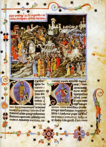 | Keywords: Chronicon Pictum P21.jpg A Képes Krónika 21 lapja A felső nagy miniatúra a magyarok bejövetelét Pannóniába a D iniciálé bizonytalan hogy Elődöt vagy Árpádot az A iniciálé szintén bizonytalan hogy Álmost vagy Árpádot ábrázolja scanned by user Csanády Chronicon Pictum PD-old |