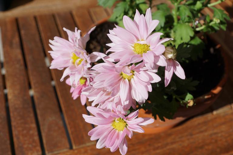 Keywords: chrysanthemum flower pink table wood nature green brown