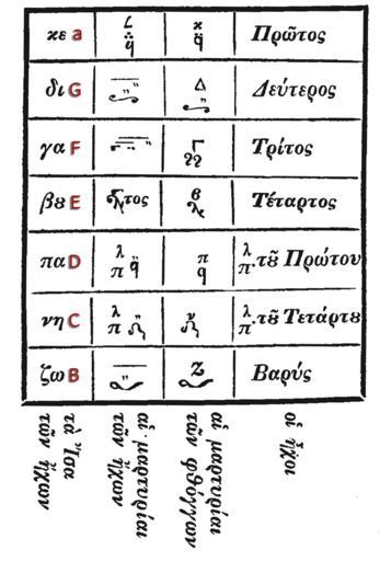 | Keywords: ChrysanthosOktoechosBaseis.png en The disposition of the eight modes main and medial signatures of the Byzantine Octoechos and their basis tones in the diapason system according to Chrysanthos of Madytos and the New Method Neume Notation since 1814 el Τῶν εἰρημένων κτὼ ἤχων αἱ βάσεις ἤγουν τὰ Ἴσα ἑκάστου αὐτῶν ὅταν ζητῆται νὰ φανερωθῶσι καὶ ἡ σῳζομένη ἐν αὐτοῖς τάξις ὸ τοῦ ξέος ἐ ὶ τὸ βαρὺ καὶ αἱ μαρτυρίαι αἵ τινες φανερόνουσι τοὺς ἤχους καὶ γράφονται ρὸ τῶν μελῶν καὶ αἱ μαρτυρίαι τῶν φθόγγων τῆς μελῳδίας αἱ τινες γράφονται ερὶ τὰ μέσα αὐτῆς εἶναι δυνατὸν νὰ ἐκφρασθῶσι μὲ τὸν τρό ον τὸν ὁ οῖον αριστᾷ ὁ ἑξῆς ίναξ Chrysanthos 1832 Θεωρητικὸν μεγὰ τῆς ουσικῆς Triest Michele Weis 168 Platonykiss annotation 2012-09-06 PD-Old PD-US-unpublished Chrysanthos of Madytos |