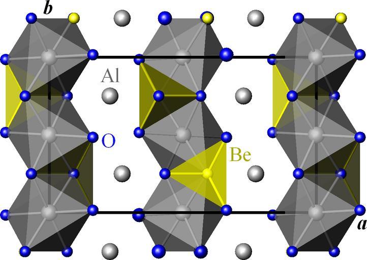 | Keywords: Chrysoberyl ab.png en Crystal structure of chrysoberyl Be AlO2 ‹2 projected onto the a b plane Gray aluminium atoms yellow beryllium atoms blue oxygen atoms own Perditax 2010-08-27 Crystal structures in space group number 62 Beryllium compounds Aluminium compounds |