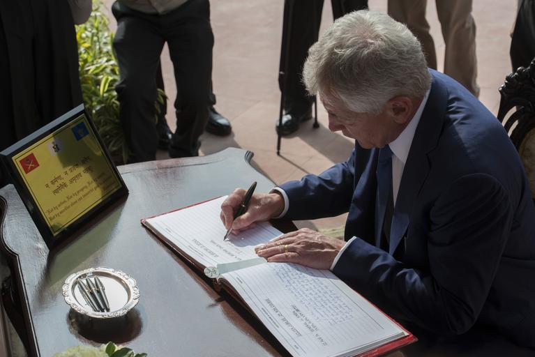 | Keywords: Chuck Hagel at the Amar Jawan Jyoti War Memorial 4.jpg New Delhi India Aug 8 2014 -- Secretary of Defense Chuck Hagel signs a guest book at the Amar Jawan Jyoti War Memorial at India Gate in New Delhi India August 8 2014 DoD photo by Petty Officer 2nd Class Sean Hurt/Released https //www flickr com/photos/secdef/14672585507/ 140808-N-AF077-302 2014-08-08 06 27 https //www flickr com/people/68842444 N03 Ash Carter PD-USGov Secretary of Defense https //flickr com/photos/68842444 N03/14672585507 2015-12-11 09 55 04 United States Government Work Chuck Hagel in India 2014 in New Delhi Amar Jawan Jyoti Tomb of the Unknown Soldier |