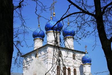 Keywords: church architecture white walls 6 white towers bright blue domes building onion domes golden crosses and stars decorative religion russian orthodox blue sky tree trunks branches