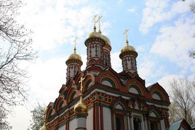 Keywords: church building architecture religion multicolored towers cupolas gold ornate decorative sky clouds