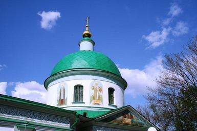 Keywords: church building religion architecture russian orthodox white walls bright green roof unusual dome small golden cupola trees sky