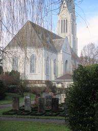 Keywords: church building steeple architecture graves cemetery amriswil switzerland