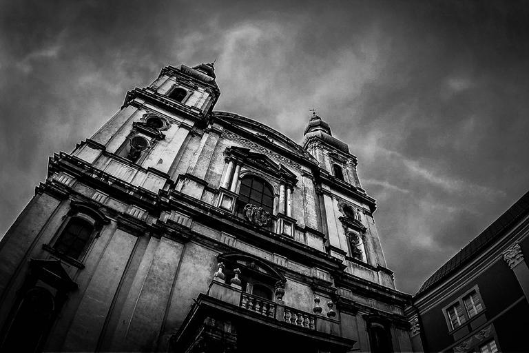 Keywords: church night city twilight the prospect of the darkness architecture black and white buildings poland street light façades