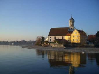 Keywords: church of st george wasserburg lake constance mirroring evening sun