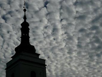 Keywords: church steeple spire sky dramatic clouds clouds form dusk mood atmosphere