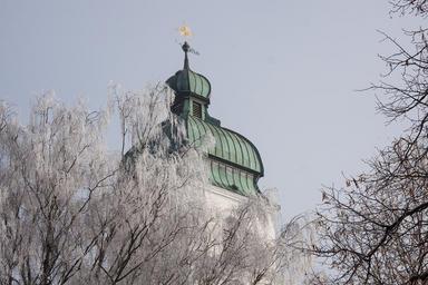 Keywords: church steeple sun sunny hoarfrost winter mood cold frost trees landscape format
