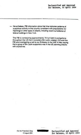 | Keywords: CIA Memo2.jpg  Page 2 of 2 from a CIA memo dated August 2001 concerning a possible attack by Bin Laden on the United States of America Original text en wikipedia by en User Andrei Stroe using http //tools wikimedia de/~magnus/commonshelper php CommonsHelper <br/> original text 1 National Security Archives 6 August 2001<br/> first version ; last version Unknown CIA Wiki1609 wikipedia en Later version s were uploaded by Noahcs at http //en wikipedia org en wikipedia Wiki1609 wikipedia en Original text PD-USGOV-CIA <br/> original text 1 Declassified by the US Government on 10 April 2004 60px page 1 of 2 Original upload log en wikisource Billinghurst CommonsHelper en wikisource Memo2 jpg 2006-07-10 01 21 Sherurcij 1120×1859× 161485 bytes <nowiki></nowiki> CIA documents Secrecy Documents of the government of the United States Osama bin Laden PD-USGov  |