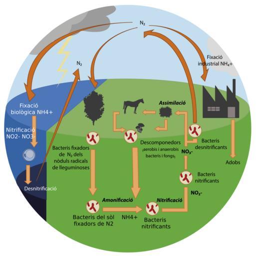 | Keywords: Cicle del nitrogen.svg ca El nitrogen de l'atmosfera N2 és incorporat a la biosfera exclusivament per bacteris En terra pels bacteris fixadors dels nòduls radicals de lleguminoses i algunes altres plantes Els animals herbÃvors l'adquireixen de les plantes que mengen Les restes orgà niques dels animals en descompondre's són absorbides pels organismes descomponedors bacteris i fongs i s'incroporen al sòl En el mar també hi ha bacteris fixadors de nitrogen Els bacteris del sòl fixadors de nitrogen mitjançant el procés d ™amonificació transformen l ™N2 en NH4+ Al seu torn els bacteris nitrificants mitjançant el procés de nitrificació transformen el NH4+ en NO2- Altres bacteris nitrificants transformen l ™NO2- en NO3- Finalment els bacteris desnitrificants transformen l ™NO3- en N2 que torna a l'atmosfera El N2 també és transformat en NH4+ a través de la fixació industrial principalment per a la fabricació d'adobs En el mar el nitrogen atmosféric també és transformat en NH4+ a través de la fixació biològica principalment pels cianobacteris els raigs afavoreixen el procés El procés d ™anammox que duen a terme alguns bacteris anaerobis transforma directament NO2- en gas nitrogen N2 que torna a l'atmosfera Il·lustració vectorial realitzada amb l'assessorament de Mercè Piqueras biòloga Amical Wikimedia 2015-06-15 own Eme Chicano other versions <gallery> Cicle del nitrogen svg Catalan version Ciclo del nitrógeno - Mudo svg Spanish version Nitrogen Cycle 1 svg English version Ciclo del nitrógeno - Mudo svg Mute version for multilingual purposes </gallery> cc-zero Nitrogen cycle Uploaded with UploadWizard Uploaded via Campaign wikiArS |