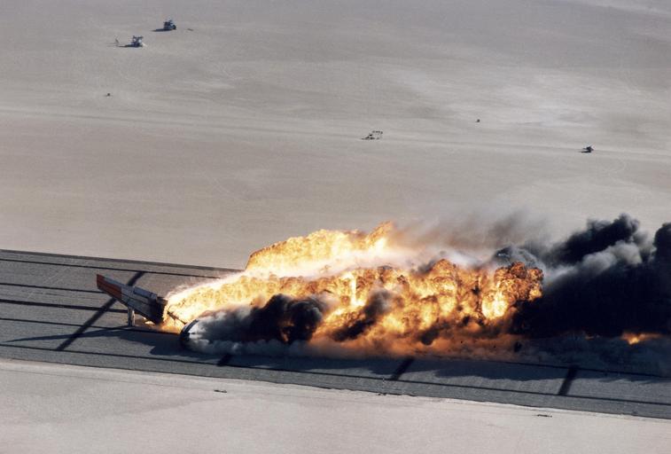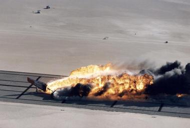 | Keywords: CID Post-impact fireball DVIDS727621.jpg en Following its controlled impact on posts imbedded in the lakebed the B-720 is sliding sideways and almost enveloped in the large fireball with only the aircraft's nose and right wing-tip exposed In a typical aircraft crash fuel spilled from ruptured fuel tanks forms a fine mist that can be ignited by a number of sources at the crash site In 1984 the NASA Dryden Flight Research Facility after 1994 a full-fledged Center again and the Federal Aviation Administration FAA teamed-up in a unique flight experiment called the Controlled Impact Demonstration CID to test crash a Boeing 720 aircraft using standard fuel with an additive designed to supress fire The additive FM-9 a high-molecular-weight long-chain polymer when blended with Jet-A fuel had demonstrated the capability to inhibit ignition and flame propagation of the released fuel in simulated crash tests This anti-misting kerosene AMK cannot be introduced directly into a gas turbine engine due to several possible problems such as clogging of filters The AMK must be restored to almost Jet-A before being introduced into the engine for burning This restoration is called degradation and was accomplished on the B-720 using a device called a degrader Each of the four Pratt Whitney JT3C-7 engines had a degrader built and installed by General Electric GE to break down and return the AMK to near Jet-A quality In addition to the AMK research the NASA Langley Research Center was involved in a structural loads measurement experiment which included having instrumented dummies filling the seats in the passenger compartment Before the final flight on December 1 1984 more than four years of effort passed trying to set-up final impact conditions considered survivable by the FAA During those years while 14 flights with crews were flown the following major efforts were underway NASA Dryden developed the remote piloting techniques necessary for the B-720 to fly as a drone aircraft; General Electric installed and tested four degraders one on each engine ; and the FAA refined AMK blending testing and fueling a full-size aircraft The 15 flights had 15 takeoffs 14 landings and a larger number of approaches to about 150 feet above the prepared crash site under remote control These flight were used to introduce AMK one step at a time into some of the fuel tanks and engines while monitoring the performance of the engines On the final flight No 15 with no crew all fuel tanks were filled with a total of 76 000 pounds of AMK and the remotely-piloted aircraft landed on Rogers Dry Lakebed in an area prepared with posts to test the effectiveness of the AMK in a controlled impact The CID which some wags called the Crash in the Desert was spectacular with a large fireball enveloping and burning the B-720 aircraft From the standpoint of AMK the test was a major set-back but for NASA Langley the data collected on crashworthiness was deemed successful and just as important NASA Identifier NIX-EC84-31809 2009-09-23 Glenn Research Center https //www dvidshub net/image/727621 appears corrupted Alternate source http //www nasa gov/centers/armstrong/multimedia/imagegallery/CID/index html id 358958 727621 2012-10-17 14 08 WASHINGTON DC US PD-USGov Controlled Impact Demonstration Images from DoD uploaded by Fæ |
