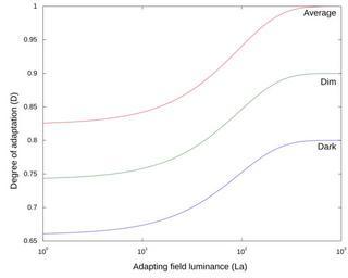 Keywords: Ciecam02 degree of adaptation.svg Semilog plot of D in CIECAM02 Own 2008-02-09 Adoniscik MATLAB Source <pre> f 0 8 0 9 1 0 la logspace 0 3 d f' 1-exp - la+42 /92 /3 6 semilogx la d' </pre> CIECAM02