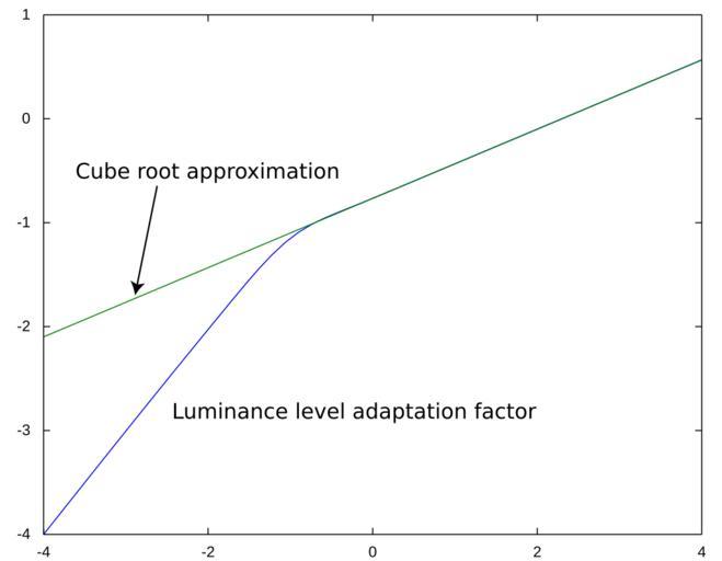| Keywords: Ciecam02 luminance level adaptation factor.svg CIECAM02 log-log plot of luminance level adaptation factor and its cube root approximation versus the luminance level of the adapting field The axes indicate the base 10 logarithm of the quantity so L<sub>A</sub> ranges from 10<sup>-4</sup> to 10<sup>4</sup> while F<sub>L</sub> ranges from 10<sup>-4</sup> to 10 MATLAB 2008-02-12 Myself MATLAB Code <pre> la logspace -4 4 k 1 / 5 la+1 fl k 4 la+0 1 1-k 4 2 5 la 1/3 loglog la fl la 0 1715 la 1/3 set gca 'XTickLabel' -4 2 4 'YTickLabel' -4 1 </pre> If you are curious as to how I derived the 0 1715 coefficient you need simply substitute la 1 to get k 1/6 and fl 0 1715 CIECAM02 |