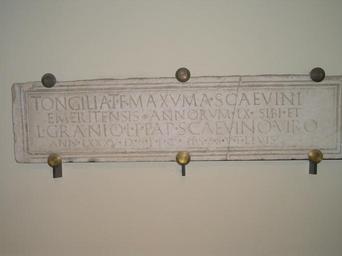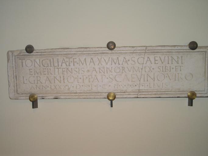 | Keywords: CILII2,7,922.JPG es Inscripción CIL II2 7 922 procedente de Zalamea la Serena Badajoz la antigua Iulipa depositada en el Museo Arquológico Provincial de badajoz cuyo texto dice TONGILIA· T iti · F ilia · MAXVMA· SCAEVINI/ EMERITENSIS· ANNORVM· LX· SIBI·ET/ L ucio · GRANIO· L ucii · F ilio · PAP iria · SCAVINO· VIRO/ ANN orum · LXXXV· D e · S ua · P ecunia · F aciendum · C uravit / H ic · S iti · S unt · S it · V obis · T erra · L evis de Epigraphische Datenbank Heidelberg http //edh-www adw uni-heidelberg de/edh/inschrift/HD029813 HD029813 es Hispania Epigraphica http //eda-bea es/pub/record_card_2 php refpage 2Fpub 2Fsearch_select php quicksearch CIL+II2 2C+7 2C+922 rec 4495 4495 own Caligatus 2007-08-20 Ancient Roman inscriptions in Extremadura Zalamea de la Serena Linked to EDH Linked to HEp Museo Arqueológico Provincial de Badajoz |