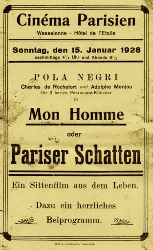 Keywords: Cinéma Parisien Wasselonne 1928.png fr Wasselonne Cinéma Parisien Affiche de la première séance le 15 janvier 1928 1928-01 Coll Frédéric Brommvorst Wasselonne Imprimerie Rosenfelder Wasselonne Typographie de 1928 PD-old Wasselonne Pola Negri Movie posters of France |