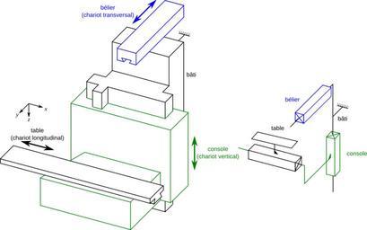 | Keywords: Cinematique fraiseuse conventionnelle tete belier.svg en Kinematics of a milling machine the movement of the piece relative to the tool is made by three translations fr Cinématique d'une fraiseuse conventionnelle le mouvement de la pièce par rapport à l'outil est réalisé par trois translations own Cdang 2010-09-02 inkscape Milling machines Trajectories ISO 3952 kinematic diagrams | ||||