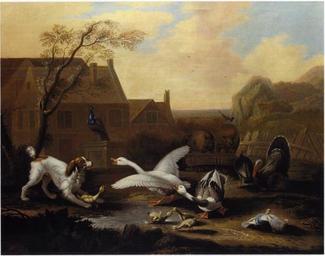 | Keywords: Circle of Pieter Casteels III - A spaniel threatening geese in a farmyard.jpg Artwork Circle of creator Peter Casteels III en A spaniel threatening geese in a farmyard 1st half of 18th century Rafael Valls Art dealer Recent Acquisitions Rafael Valls 1992 p 9 Oil canvas cm 102 2 127 9 Private collection sold by Christie's on 9 - 10 September 2008 in Amsterdam as lot 2798 Other versions PD-old-100 Peter Casteels III 18th-century still life paintings in private collections 1700s still life paintings |