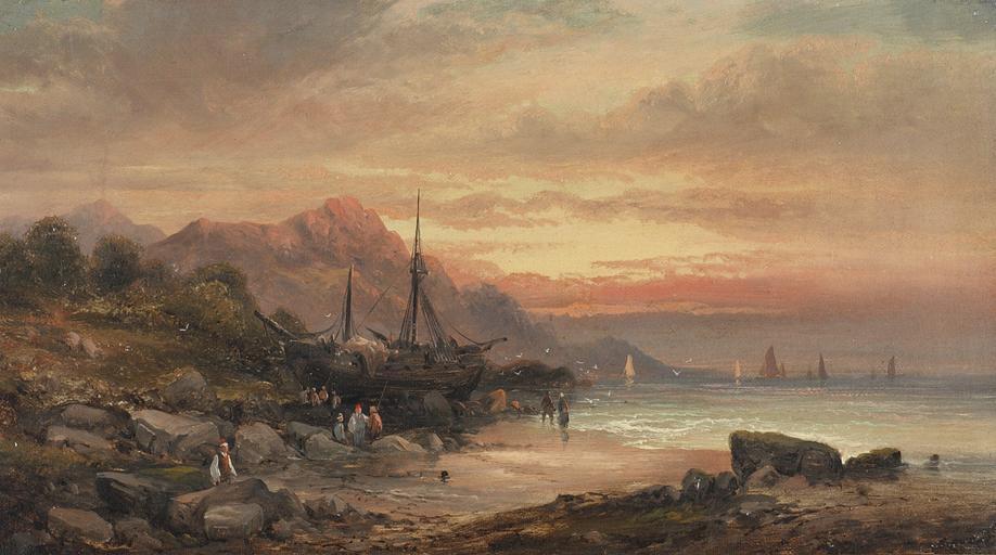 | Keywords: Circle of William Anslow Thornley - Coastal scene with islet and fishing folk; and another of fisherfolk on the shore (II).jpg Artwork William Anslow Thornley Circle of century 19 British oil canvas cm 24 5 44 object history credit line accession number http //www bonhams com/auctions/17089/lot/250/ Bonhams PD-Art-100 DEFAULTSORT William Anslow Thornley - Coastal scene with islet and fishing folk; and another of fisherfolk on the shore William Anslow Thornley Oil paintings of seascapes Paintings of sailboats Images from Bonhams Paintings of seascapes with sunset Sailboats at sunset |