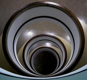 Keywords: circular repeat round concentric stairwell white lights reflecting building architecture indoors from above