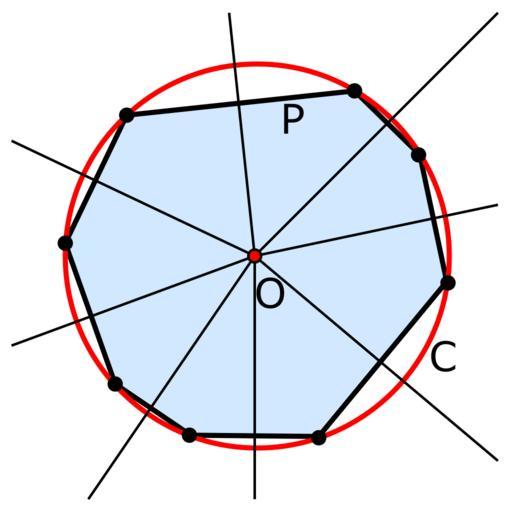 | Keywords: Circumscribed Polygon.svg  Diagram to show the construction of the circumcentre O and circumcircle C red of a polygon P black showing perpendicular bisectors of each edge of the polygon Own drawing Inkscape 0 45 07/05/2007 Inductiveload Circumcircles |