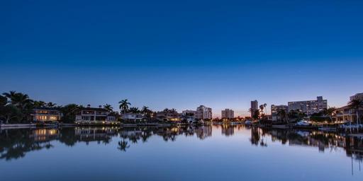 Keywords: citiy urban evening scene illuminated lights night dark lake waterfront seaside calm glassy mirror reflection buildings apartments residential palm trees tropical escape cityscape