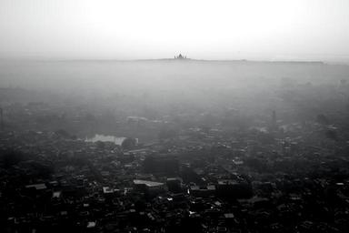 Keywords: city aerial view buildings rooftops architecture fog sky black and white