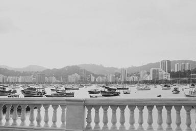 Keywords: city bay lagoon harbor port boats vessels ocean sea water skyline buildings balustrade hills view lookout bw black and white