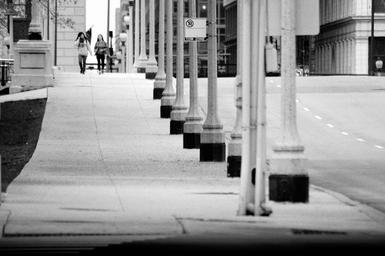 Keywords: city corner landscape black and white street people walk pedestrians pavement