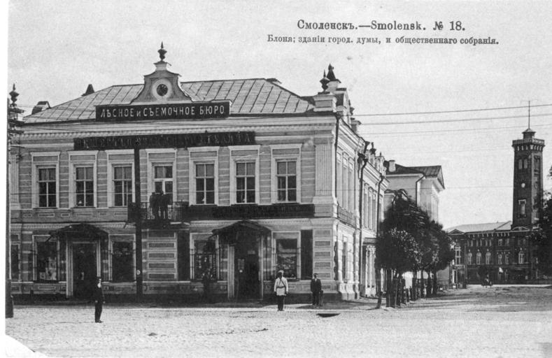 | Keywords: City Council and Smolensk Noble Assembly.jpg en In the foreground - the building of Forest and Bureau of shooting then the building Nobility now - the Philharmonic and the City Council now - the house ru а пе еднем плане - здание Лесного и съёмочного бю о далее здания Дво янского соб ания ныне - фила мония и го одской думы ныне - жилой дом О игинальная отк ытка е установлены before 1917 года PD-RusEmpire 20th-century postcards of Russia Postcards of Smolensk | ||||