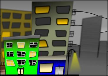 Keywords: city downtown skyscrapers buildings light night street illuminated gray blue green scenery